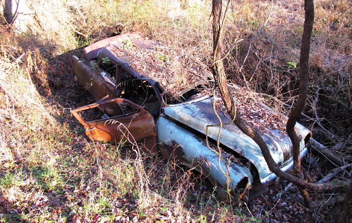 I have to admit that I couldn't fathom how the car had gotten there.  We were hundreds of yards into some fairly thick woods (note the thickness of the grape vine in the foreground) and the creek bed was about 5-6ft deep.  Either it was dropped there from a crane (or helicopter) or it was wrecked there when it was new & the forest grew up around it.